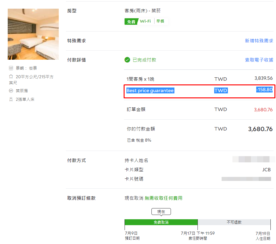 但自己還是第一次使用,而且最低價格來自於agoda網站(本來不知道最低價格來自於Agoda網站可不可以退…)我看到了即將入住的飯店,agoda網站有TWD3680的價格,而我當初訂的房價是TWD3839,剛好是今天扣款所以相當清楚