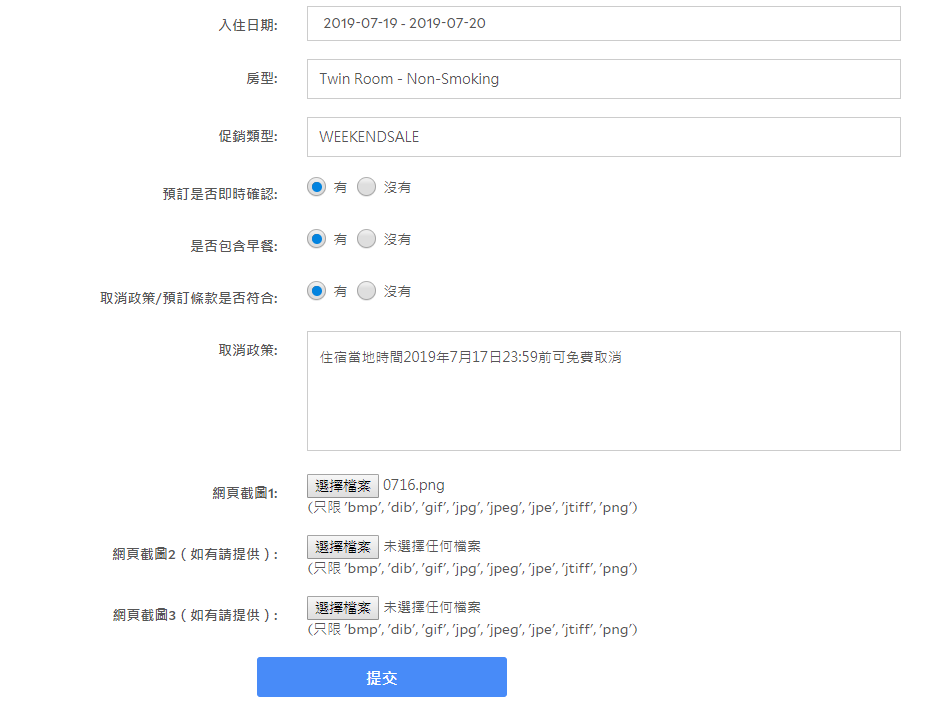 • 請附上最多3張對方網站的螢幕截圖,並需清楚標示房間的空房狀況、房間類型、促銷類型及預訂日期之房價等重要訊息