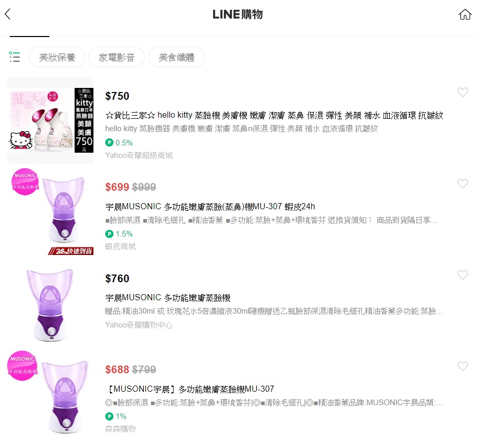 LINE購物的好處之前有分享過,最棒的地方就是只要在LINE購物搜尋、輸入商品名稱就可以一次瀏覽、比價各大平台,等於省去了一一比價的心力,超級方便