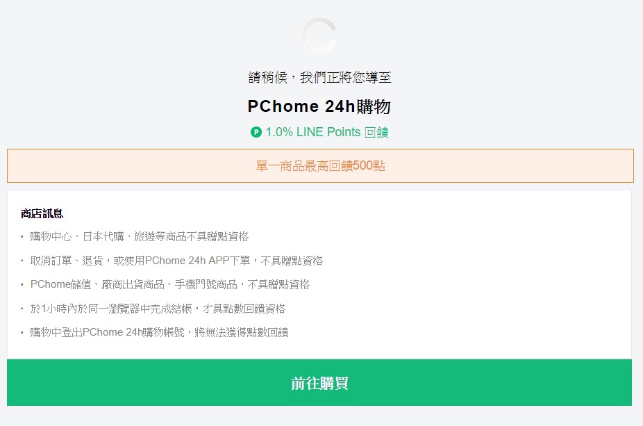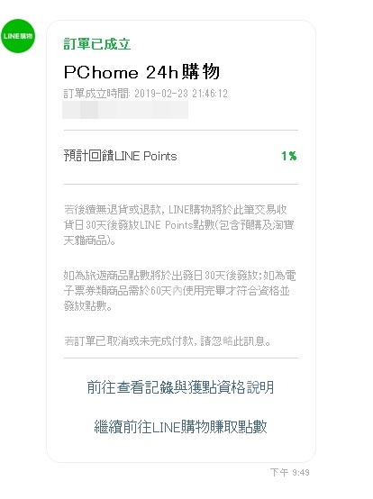 從LINE購物出發直接連到PChome24h購物下訂單,現在有1%的回饋