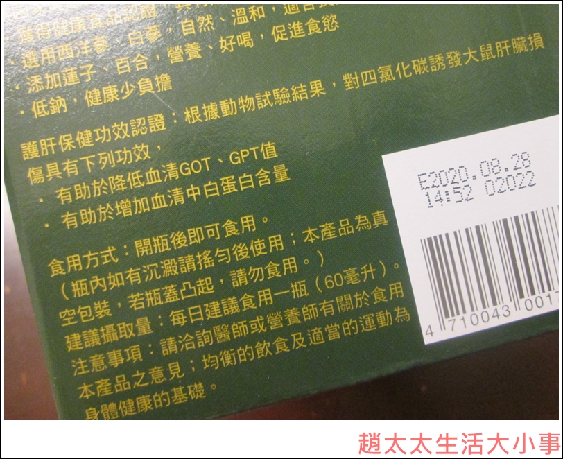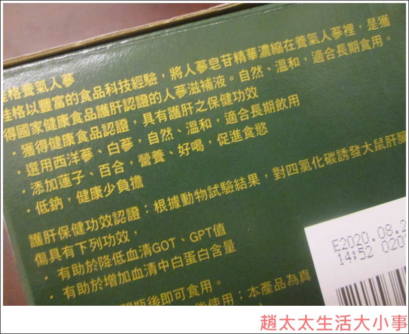 首先,我挑給自家人食用的產品,一定會仔細研究成分,【桂格】養氣人蔘原料通過SGS 426項農藥殘留與重金屬檢驗,可以放心食用,是第一瓶獲得國家健康食品護肝認證的人蔘滋補液