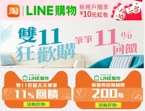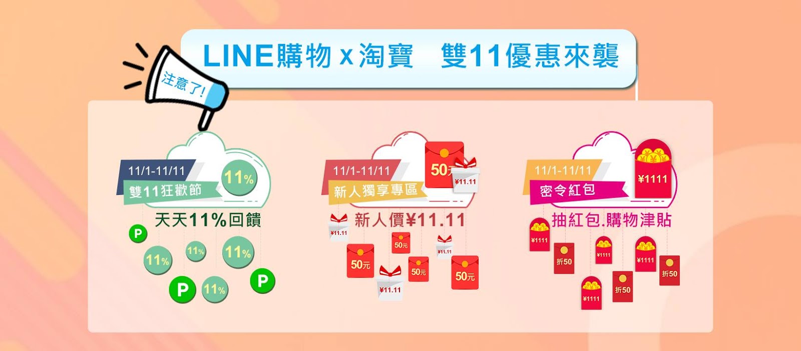 自從淘寶進駐LINE 購物之後,陸陸續續舉辦滿多活動,像是基本的LINE Points回饋,這次雙11檔期甚至推出天天可領密令紅包(10/20~11/11-天天可領密令紅包,11/11當天記得再從LINE購物進入享兩方優惠!)曬單抽LINE Points的活動,以及一樣是筆筆回饋的好康