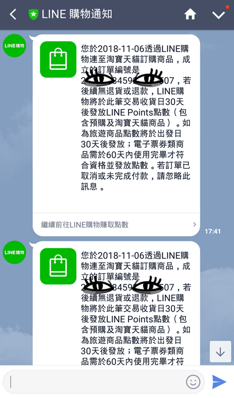 11/7我的LINE購物也收到通知囉,就是到貨後可以收到LINE點數喔XDD