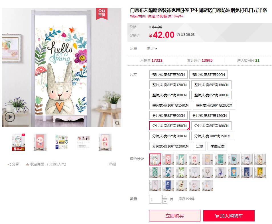 首先想要幫家裡添購的是門簾,我發現淘寶網站上的風水簾(門簾)花色,以及尺寸大小選擇真的很多,無論是想要可愛的動物風,還是清新的北歐風都很好選