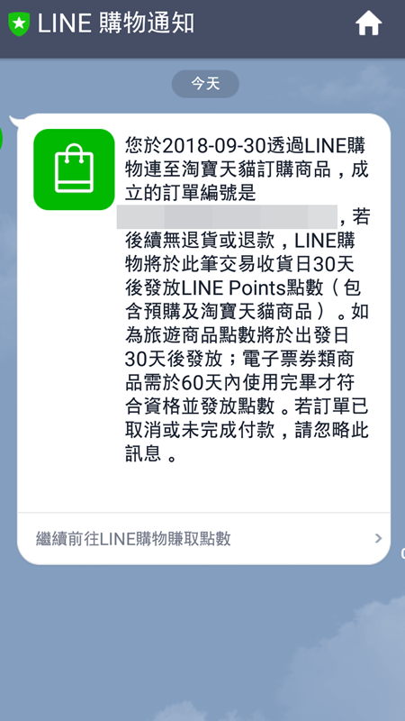 兩筆都是在深夜訂購、付款,隔天一早就收到LINE購物的通知,說有透過LINE訂購淘寶天貓全球官方店,若是訂單OK,就會得到回饋的LINE Points點數回饋