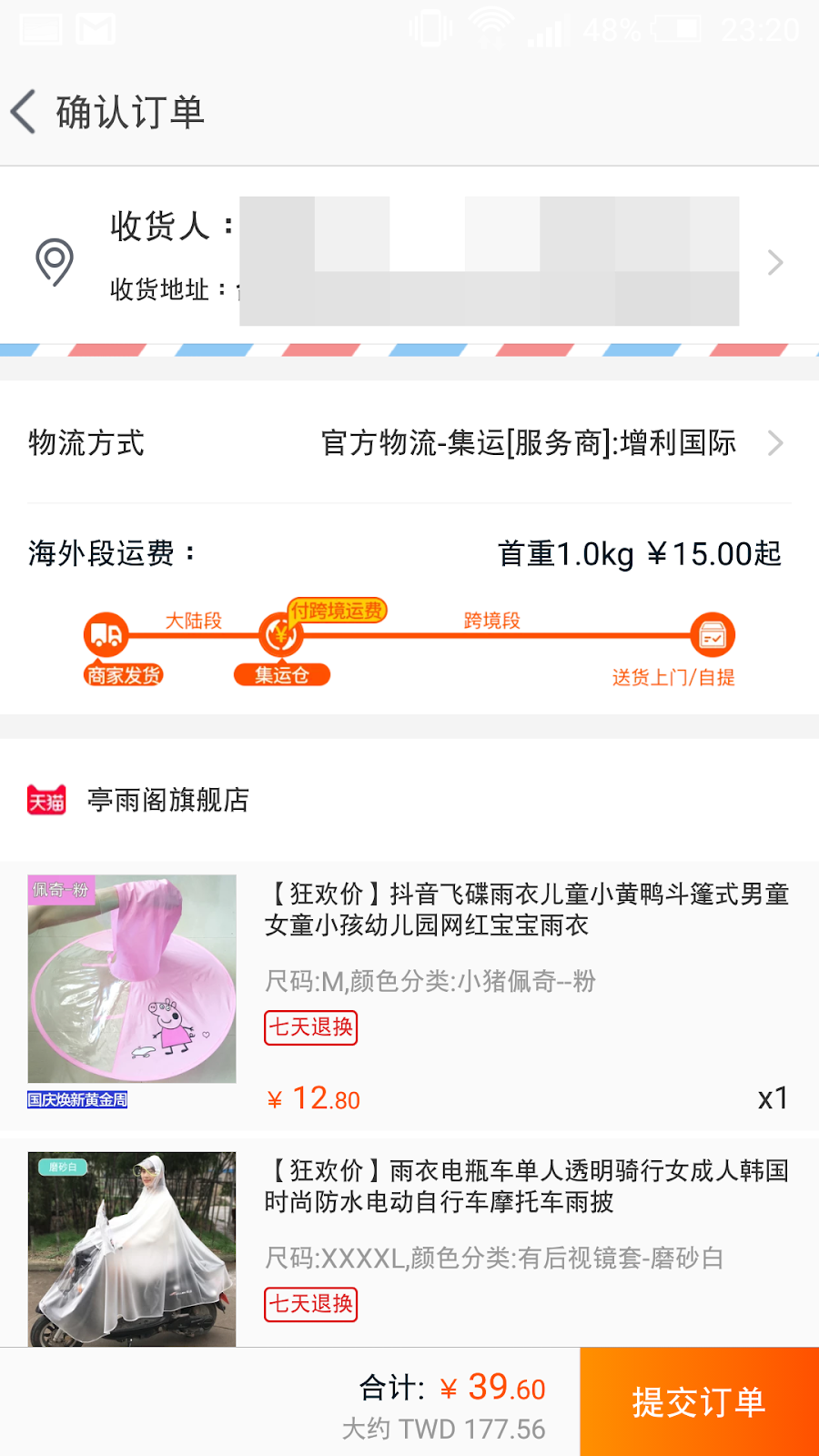 我是用官方的增利集運,想說不趕所以也試試看,很快就收到囉。斗篷式的雨衣也是另一種選擇,下小雨時可以使用!!!